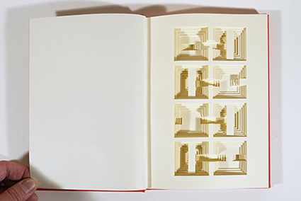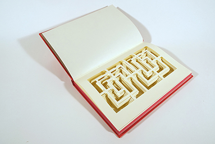 | アカサカヒロコ:《ブックオブジェ red&white No.3》/ 《ブックオブジェ red&white No.5》 アカサカは、薄い紙の層を手作業で切り込み、既存の本の中に新たな空間を創り出します。こうした新たな空間の創出によって、「本の中の空間」の定義は変化します。 |