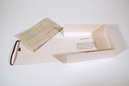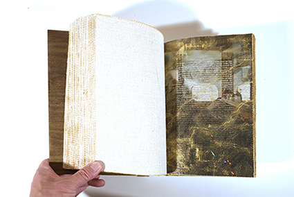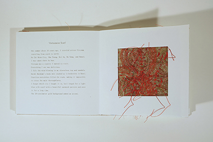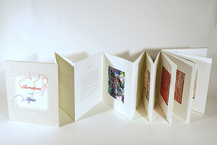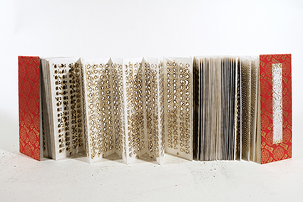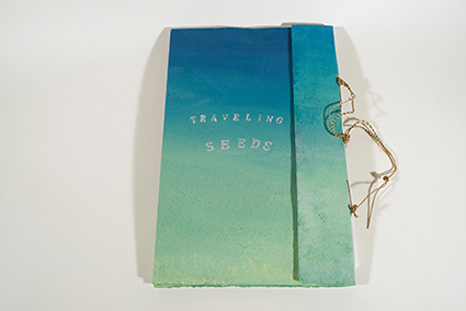 | 中西晴世:《種の旅》 *手漉き画用紙、和紙(こうぞ)、麻ひも・リトグラフ、牛乳パックドライポイント、アクリル絵具/2005年 | Maryam Farazhbod :《Flag》 *紙・印刷、アセテートを挟んだアコーディオン綴じ/2009年 | 中西晴世+Maryam Farazhbod |