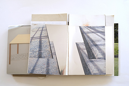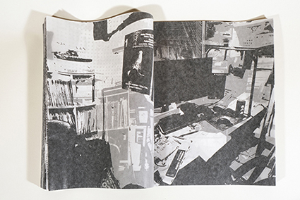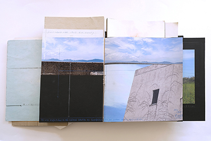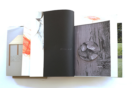 | 黒田麻紗子:《マノ百景》 黒田の印刷スタジオの周囲の風景が、薄いグラシン紙にスクリーン印刷されています。ページは内側に折り込まれており、元のイメージの強いコントラストを和らげることで、作家が多くの時間を過ごす馴染み深い環境に、夢のような雰囲気を与えています。 |