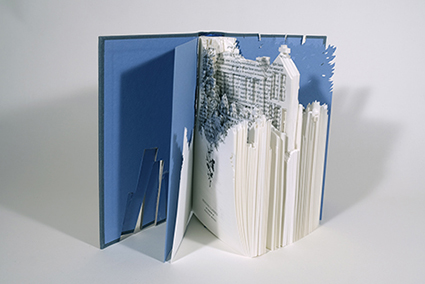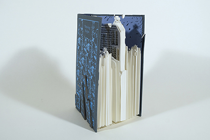 | 私は自分の好きな書籍を使って、その世界観を立体にしています。今回は読むと自分の常識が揺らいでくるような物語を選んで作品にしました。切って折って作品にすると、その本はもうページを捲る事が出来なくなります。そのまま本棚に置かれていたらそれを読む楽しみがあったのに、作品にする事はもしかしたら迷惑な行為かも しれません。それでもこれは私にとって大切な「本」という存在であるという事を問い掛けていきたいのです。 |