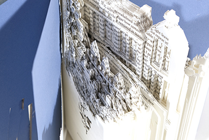 | 薄い紙を重ねて切り抜くことによって生まれる空間に魅せられています。きっかけは、2000枚以上のトレーシングペーパーを重ねた直方体の塔の内部に周り階段を出現させた作品を作成したことです(https://youtu.be/k5iiuN3GLb0)。その空間を持ち運びの出来るものにしたのが、私のブックオブジェ作品たちです。本を開くと、白い大地の地層と、地下への階段が見えます。これを見る人は巨人の視点、あるいはアリの視点を体験するでしょう。 | |||