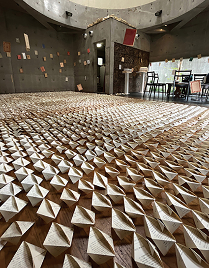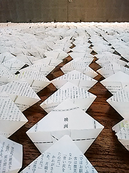 | 佐藤省:《しじまをわたる光の風》 佐藤はこの作品のために、120冊の日本の文庫本を解体し、一枚一枚丁寧に折り畳みました。インスタレーションのサイズは、作品を展示する空間の大きさに応じて変化します。ウィンチェスター・ギャラリーでのインスタレーションでは、900ページが選ばれました。解体された本は、ページを開いたり、再び組み合わせたりすることで、再び組み立てられます。この作品は、過去、現在、未来を繋ぐ道筋が一本ではなく、絡み合い、重なり合い、過去と未来を行き来できることを表現しています。 |