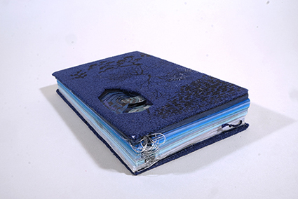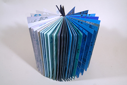 | David Jackson :《Wave》 フェルト製コンサーティーナブックは、海に打ち寄せる波から砂浜に打ち寄せる波までを、写真を通して表現しています。海の描写と青い色に惹かれて、この本を中川の《深海魚が来る日》に添えることにしました。 |