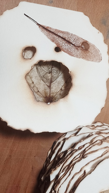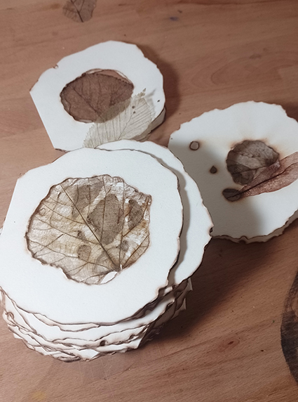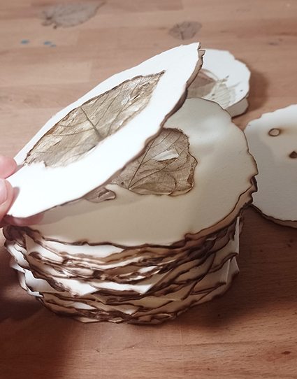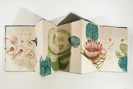 | 自然物と人体の一部をモチーフに作品を制作。主にノントキシック銅版画、紙版画などの技法を使用する。木の表皮や葉を表紙に使用する手製本なども制作。又、絵本制作においては、民話好きなので、在住しているスロバキアや近隣の国の民話の再話・挿画を制作。 出品作品について:不規則な形の折丁と穴、折丁に挟まる葉脈を残した葉を重ねることにより、切り株にあいた穴のような、木のうろのような、虫や鳥に穴を開けられたような偶然出来上がる形を、蛇腹本として綴じた作品。 |