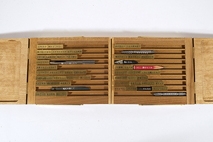 | 読むたびに内容が変化する本を制作している。木箱の中に言葉が刻まれた真鍮の角棒を収め、鑑賞者はそれらを自由に入れ替えることができる。そのたびに言葉の断片は新しい文章となって現れ、それまでの鑑賞者が残した痕跡が次の読み手へと引き継がれていく。また、文字を忍ばせた文具や工具を加えることで、言葉の意味とモノのもつ機能との間に生まれる認知のずれを感じ取ることを促し、「読む」行為そのものの在り方を探っている。 | |||