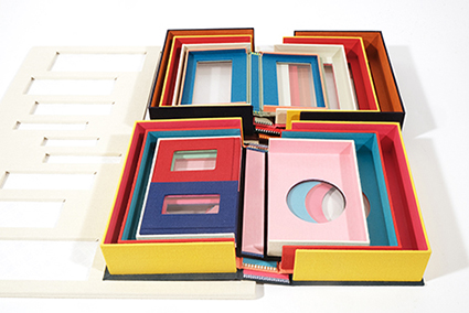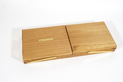 | 山崎曜:《BOOOX----本の形の箱のマトリョーシカ》 山崎は本を箱、つまり様々な物語を運ぶ器として想像しました。マトリョーシカ人形のように入れ子になった箱は、開けたり閉じたり、重ねたりすることで、無限の物語の可能性を秘めています。山崎は、本の形態に似ていることから、手前に開く「夫婦箱」という構造を用いています。 |