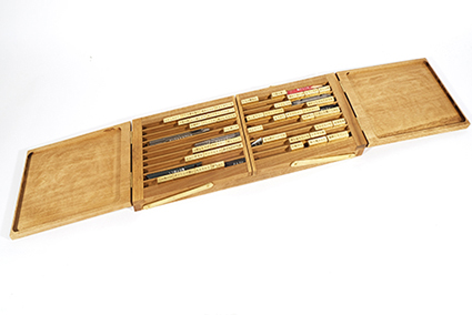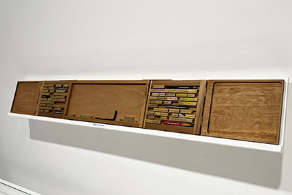 | 廣瀬剛:《Collage of Words :type/Tools》 この作品は「読む」という行為のメカニズムを探求しています。木箱の中に収められた真鍮の棒や、様々な言葉が刻まれたその他のアイテムを組み替えることで、様々な文章やフレーズを作り出すことができます。 |