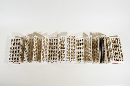 | Ti Parks:《Five Fold》 5枚の白い紙で構成されたミニチュアブック。各紙は5回折り畳まれ、ワックス糸で縫い合わされています。サイズと形状は全く異なりますが、《ファイブ・フォールド》は城戸の「フリクション」や「ハグス」と共通点があるように感じます。どちらも開くことができず、両アーティストとも本という形態を通してアクセシビリティを追求しているからです。 |