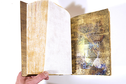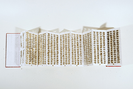 | 福本浩子:《Book of BabelーSutra》 *紙(既成経本)、布/2025年 | Jim Butler :(Ash Wednesday(灰の水曜日) *紙・活版印刷、ブラインドエンボス加工/2006年/エディション:12部 | 福本浩子+Jim Butler |