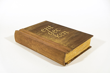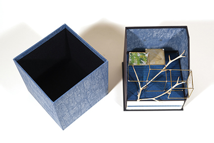 | 私は手で製本をする人として、日々設計したり作業したりして本を作っている。いつも本という特殊な物について考えている。毎日、本のまわりを散歩してるような感じだ。そこで拾ったものや思いついたものを使って、何かを作るのが、私のブックバインディングアートだ。 出品作品について:本は入れ子だ。中にお話などが入ってると考えると、本は箱に見える。蝶番的に開く「夫婦箱」は最も本に似た箱といえる。そこに表紙やミゾ、花ぎれを加えて本の形のギミックにした。マトリョーシカ的な入れ子箱は、出して並べたり収納したりして遊べる。 |