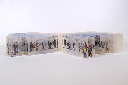 | Amandine Nabarra-Pionelli :《Voyages (en Train) 》 この本は、走行中の列車の窓から撮影された4枚の写真で構成されています。それぞれの写真は半分に分割され、それぞれがスライド式のアルミニウム板に収められています。開くと、線路の上を列車が走るときのような金属音がします。《Voyages (en Train)》が風景を捉えているように、松永の《交差点(京都、祇園)》は人々を捉えています。 |