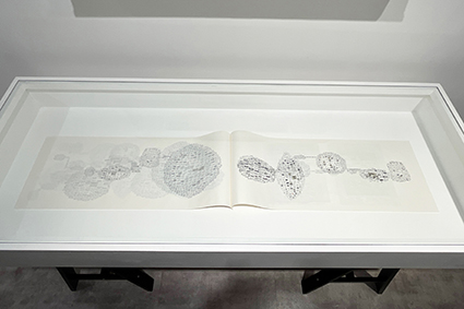 | 福本浩子:《Book of BabelーSutra》 京都の仏教書店で福本が見つけた般若心経の文字を、線香で丁寧に消して(燃やして)います。この作品は「言葉のない本」であり、物と情報の関係性を探求しています。 |