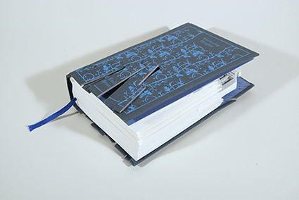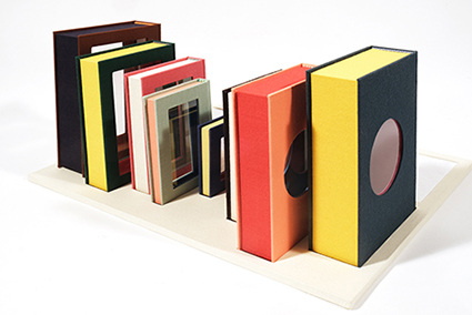 | 私は手で製本をする人として、日々設計したり作業したりして本を作っている。いつも本という特殊な物について考えている。毎日、本のまわりを散歩してるような感じだ。そこで拾ったものや思いついたものを使って、何かを作るのが、私のブックバインディングアートだ。 出品作品について:本は入れ子だ。中にお話などが入ってると考えると、本は箱に見える。蝶番的に開く「夫婦箱」は最も本に似た箱といえる。そこに表紙やミゾ、花ぎれを加えて本の形のギミックにした。マトリョーシカ的な入れ子箱は、出して並べたり収納したりして遊べる。 |