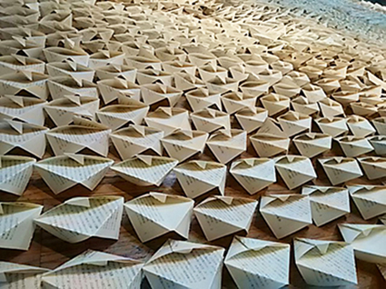 | 生と死の根源的な対比を、明示的無意識的に絡ませ、宇宙の無限生へ想いを馳せ、日々の狭間のおぼろな夢幻や、思いがけなく生成してくる幻想世界を求めながら制作している。 出品作品について:文庫本による解体と頁の折による半立体化への行為は、自分の記憶を今へ引きずり出すことで、横たわる言葉の肉体から一本の糸をたぐり寄せるように、その水脈の底へ降りてゆき付随するもの達へ想いを馳せ、あらためて言葉とは、生きるとは……を考えさせてくれた行為である。紙の匂い、感触そして文字の並びや製本など本の形からの発想など抱きつつ、かつて読んだ120冊の文庫本を解体……それは、過去は今にあり、未来も今にあり、人の人生に絡み合い多重を為す幻想夢想の世界の軌跡でもある。 |