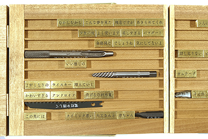 | 読むたびに内容が変化する本を制作している。木箱の中に言葉が刻まれた真鍮の角棒を収め、鑑賞者はそれらを自由に入れ替えることができる。そのたびに言葉の断片は新しい文章となって現れ、それまでの鑑賞者が残した痕跡が次の読み手へと引き継がれていく。また、文字を忍ばせた文具や工具を加えることで、言葉の意味とモノのもつ機能との間に生まれる認知のずれを感じ取ることを促し、「読む」行為そのものの在り方を探っている。 | |||