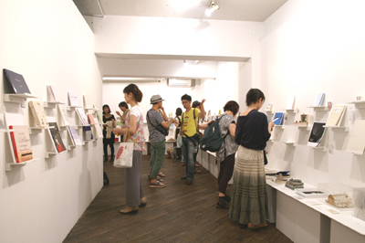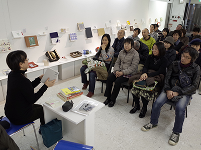 トークは最初、司会より「THE LIBRAY」展の趣旨や歴史、展覧会のもとになっているブック・アートについての考えが語られた後、中西さんが考えるブック・アートの在り方が語られました。さらに、司会と中西さんが会場を巡りながら出品作品について何点かを取り上げた後、会場の出品者からもお話しを伺い、1時間にわたるトークが、盛り上がりながら終了しました。