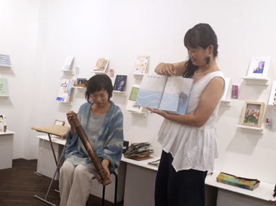 まず前半は、出品作家の怎々塚惣一商會さんによる2冊の出品作品の朗読、和泉潔さんによる自作の詩集の朗読、手良村昭子さんによる、ところどころでギター演奏のCDをかけての出品作品の読み聞かせが行われました。